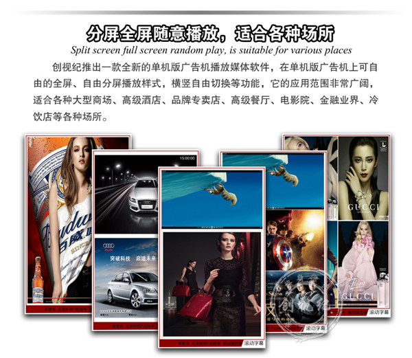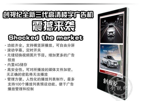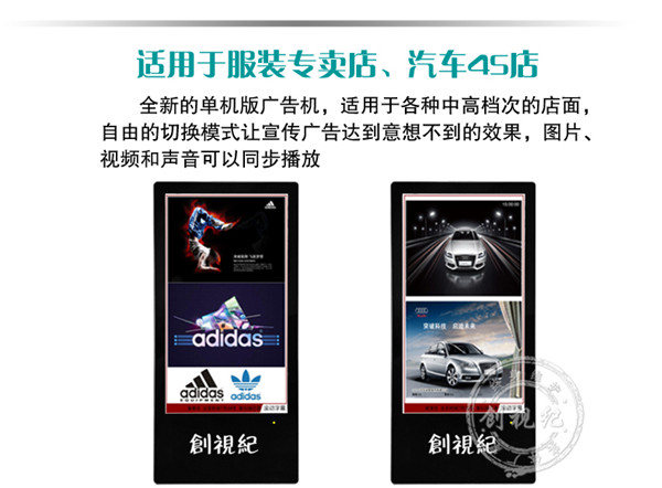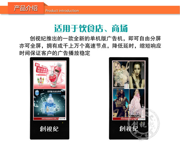 對比性 | 看家本領(lǐng): ★成本低,能滿足常規(guī)的廣告機(jī)播放功能; ★高清1080P視頻、圖片播放; ★一鍵拷貝節(jié)目、支持 HDMI接口輸入,可當(dāng)顯示器之用。不足之處:豎屏片源需要第三方軟件制作、剪輯。分屏制作繁瑣。 | 看家本領(lǐng): ★解決客戶橫豎屏轉(zhuǎn)換問題,可自動對應(yīng)機(jī)器旋轉(zhuǎn)視頻; ★內(nèi)置4G內(nèi)存,烤貝快、播放穩(wěn)定、永不卡殼; ★真正客戶自由分屏,真正的實現(xiàn)視頻,圖片,字幕,日期的隨機(jī)組合;想怎么分就怎么分; ★目前唯一能真正實現(xiàn)節(jié)目之間的無縫切換的方案; ★疊加背景圖片,使畫面更美觀; ★雙芯片、真正1080P的全高清解碼;目前只有我們和分眾傳媒使用此方案。 | 看家本領(lǐng): ★遠(yuǎn)程控制、管理、下發(fā)節(jié)目; ★兼容更多格式,天氣預(yù)報等,內(nèi)容豐富,操作so easy! ★后臺軟件功能強(qiáng)大,關(guān)鍵點是穩(wěn)定,支持同時上萬終端在線; ★隨機(jī)搭配服務(wù)器安裝軟件; ★擴(kuò)展性強(qiáng)、可安裝任意APP,滿足你的任何任性; ★支持阿里云服務(wù)器,強(qiáng)大的技術(shù)支持。真正的廣告媒體運營最佳選擇,穩(wěn)定壓到一切。不足之處:暫時沒有(這個可以有,這個真沒有...) |