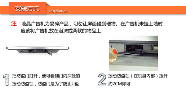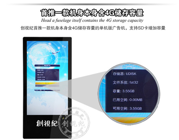 控制方式 | 通過U盤,SD卡播放播放 | 通過U盤,SD卡更新節(jié)目,直接將內(nèi)容導(dǎo)入機(jī)器內(nèi)存,(內(nèi)置4G 內(nèi)存)優(yōu)點:客戶無需另配內(nèi)存卡;拷貝速度快 | 通過電腦用網(wǎng)絡(luò)(支持有線,wifi,可選3G)連接廣告機(jī),電腦后臺統(tǒng)一遠(yuǎn)程控制、管理 |