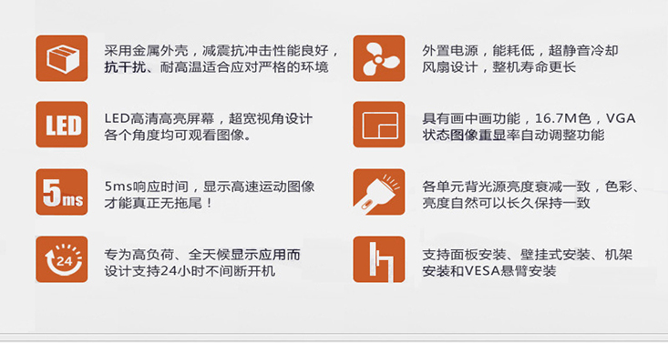 顯示亮度: 500cd/m2 | 環(huán)境濕度: <80% span=""> | 工作溫度: -10℃-60℃ |