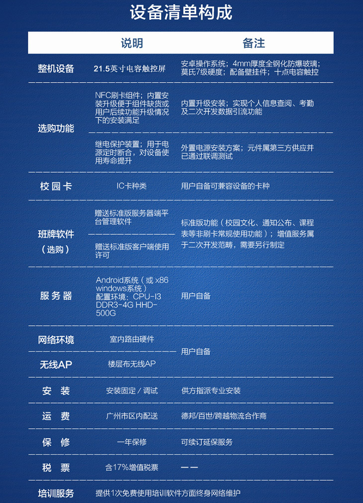 - 基礎(chǔ)數(shù)據(jù)庫(kù)系統(tǒng)是按照教育行業(yè)設(shè)計(jì)的標(biāo)準(zhǔn)數(shù)據(jù)庫(kù),包括學(xué)校信息、教師信息、教室信息、學(xué)生信息、課程信息、班風(fēng)班貌、德育評(píng)價(jià)、考試信息、考勤信息等,通過(guò)建設(shè)基礎(chǔ)數(shù)據(jù)庫(kù)系統(tǒng)可為教育信息化建設(shè)打造堅(jiān)實(shí)基礎(chǔ)。產(chǎn)品備注:電容觸摸,可選擇帶刷卡功能或不帶刷卡功能,備貨尺寸:15.6寸、18.5寸、21 5寸,其他尺寸可訂做。