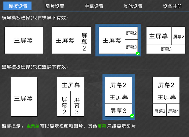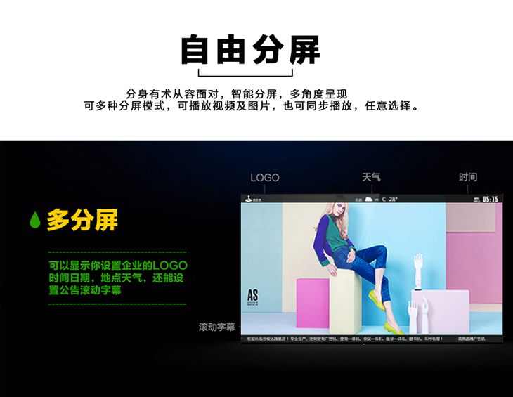 6、分屏功能:可以將圖片+視頻+滾動(dòng)字幕同時(shí)多畫面顯示,這樣獨(dú)特的顯示給廣告運(yùn)營商帶來更多商機(jī),可實(shí)現(xiàn)多家媒體的廣告同時(shí)播放。