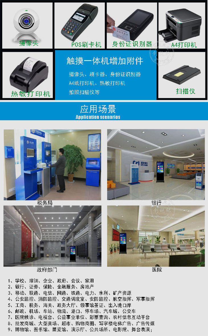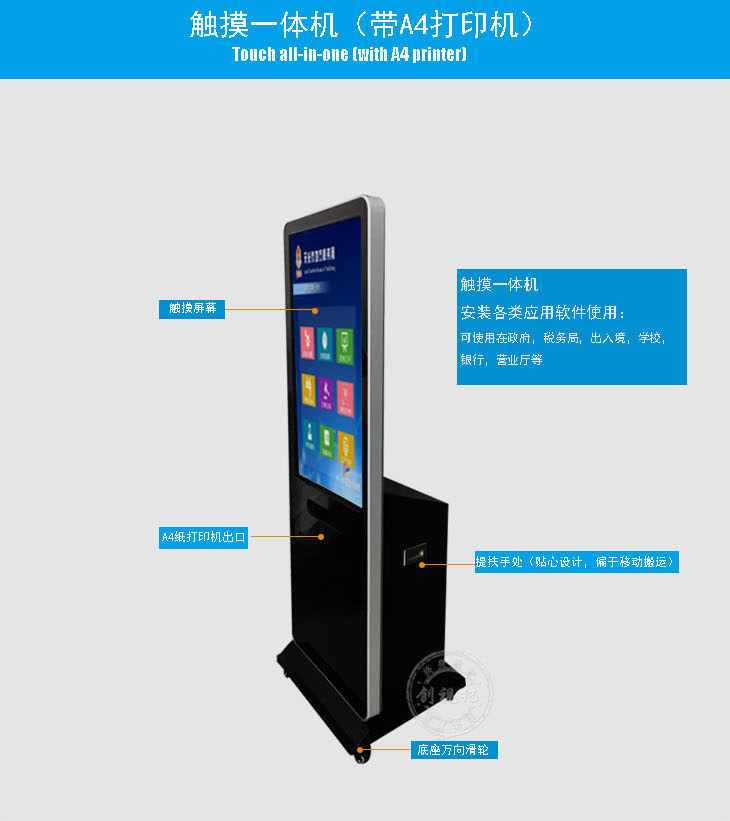觸摸屏查詢一體機(jī)帶A4打印機(jī)功能,是一款智能觸摸查詢打印設(shè)備。它集觸控、液晶顯示、電腦主機(jī),A4打印機(jī)于一體,可用于觸控互動(dòng)、查詢信息政府辦公、銀行打印流水賬單,稅務(wù)局打印稅務(wù)資料,車管所打印證件資料等。觸摸一體機(jī)主體由流暢的直線構(gòu)成,簡約,時(shí)尚,符合現(xiàn)代社會(huì)流行趨勢。整體造型設(shè)計(jì)利于人體機(jī)學(xué)設(shè)計(jì),使用戶擁有更舒適、更便捷、更貼心的視覺觸覺雙重體驗(yàn)。
