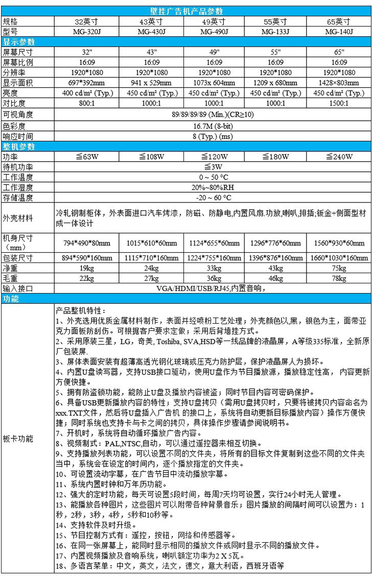 產(chǎn)品名稱: 32/43/49/55/65英寸壁掛樓宇廣告機(jī)