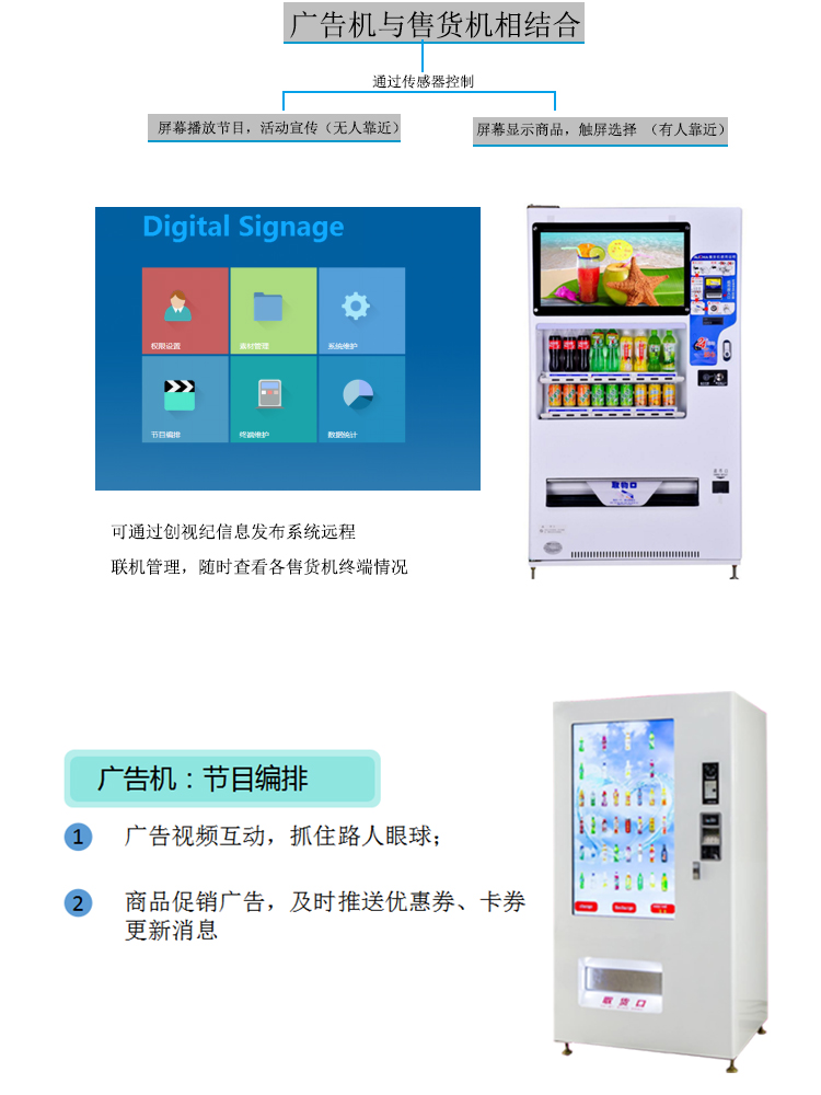 設(shè)備不僅僅具有售貨功能,更能遠(yuǎn)程聯(lián)機(jī)對(duì)各終端進(jìn)行操作和管理,同時(shí),個(gè)性的LCD廣告顯示屏播放商品廣告,及時(shí)推送消息,更具多元化、高定制化的特點(diǎn)。贏得眾多商家的喜愛(ài),