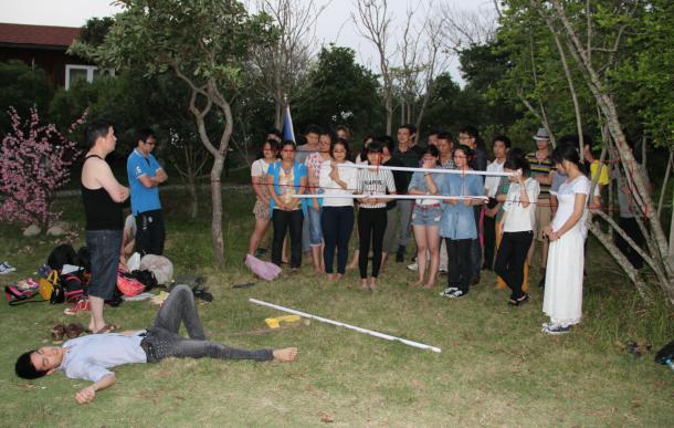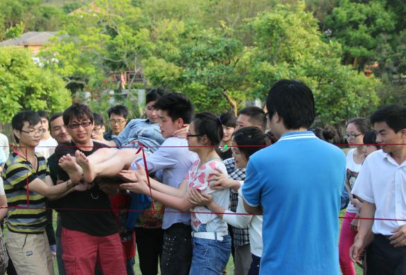 李總親自在準(zhǔn)備游戲道具,穿越火線規(guī)則,將隊(duì)員從用紅線圈成的逃生圈穿過(guò),人的身體其任何衣物不許碰到線,若碰到線,則過(guò)去的人員全部返回重新來(lái)過(guò)。