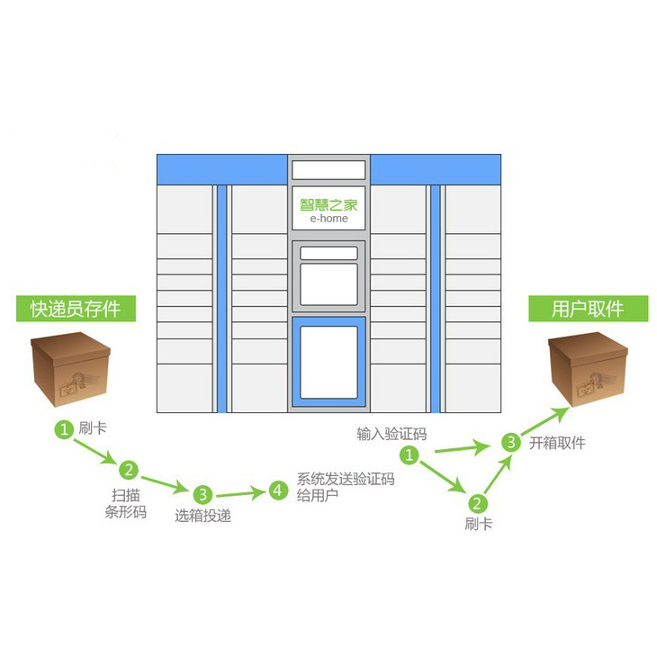 - 智能快遞投遞箱 是一個基于物聯(lián)網(wǎng)的,能夠?qū)⑽锲罚旒┻M行識別,暫存,監(jiān)控和管理的設(shè)備。與PC服務(wù)器一起構(gòu)成智能快遞投遞箱系統(tǒng)。PC服務(wù)器能夠?qū)Ρ鞠到y(tǒng)的各個快遞投遞箱進行統(tǒng)一化管理(如快遞投遞箱的信息,快件的信息,用戶的信息等),并對各種信息進行整合分析處理。快遞員將快件送達指定地點后,只需將其存入快遞投遞箱,系統(tǒng)便自動為用戶發(fā)送一條短信,包括取件地址和驗證碼,用戶在方便的時間到達該終端前輸入驗證碼即可取出快件。該產(chǎn)品旨在為用戶接收快件提供便利的時間和地點。